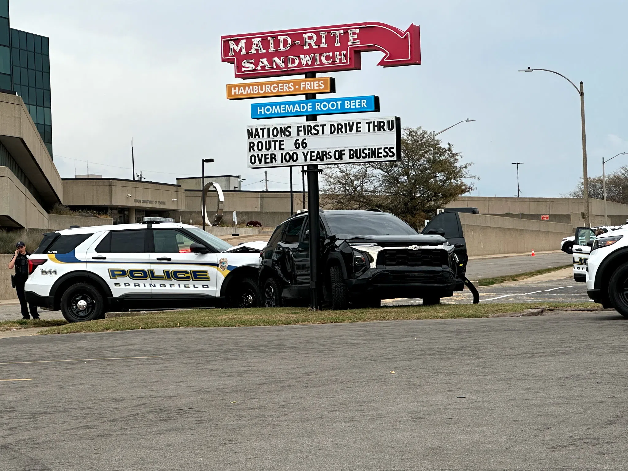 A car chase in downtown Springfield came to an end beneath the Maid-Rite Sandwich shop sign on Saturday.