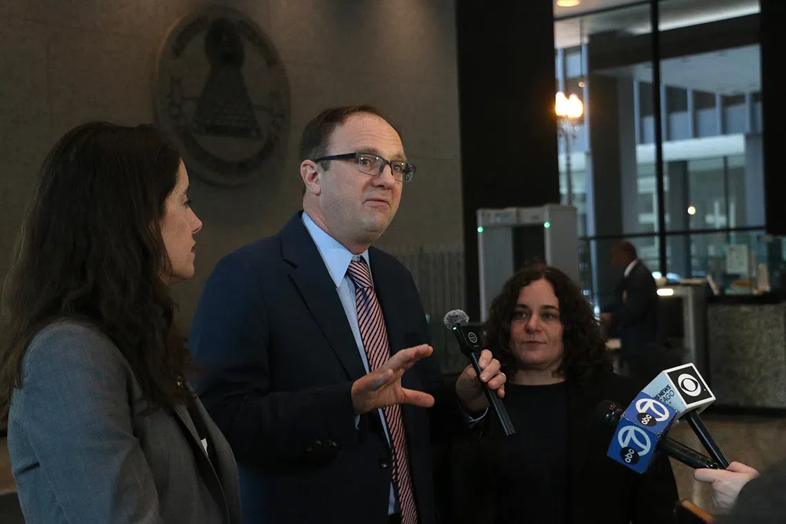 National Immigrant Justice Center attorneys Mark Fleming and Keren Zwick, right, and ACLU of Illinois attorney Michelle García speak to reporters at the Dirksen Federal Courthouse in downtown Chicago after a Feb. 13, 2026, hearing on warrantless immigration arrests amid Operation Midway Blitz. (Capitol News Illinois photo by Maggie Dougherty)